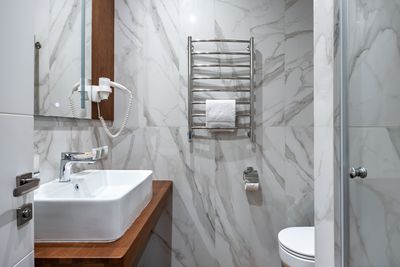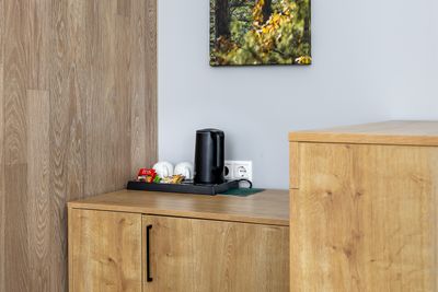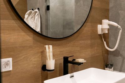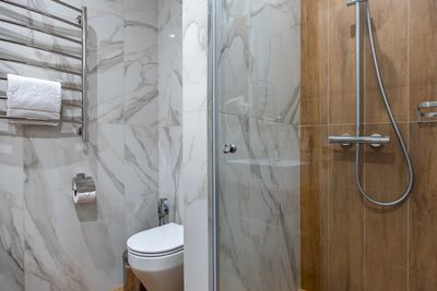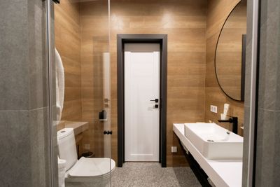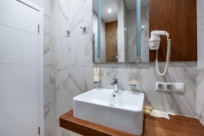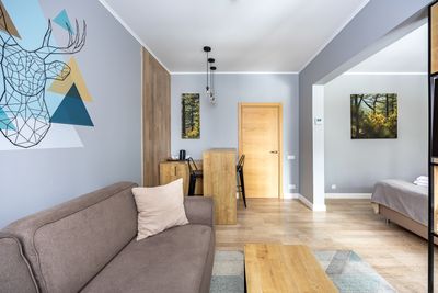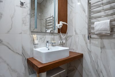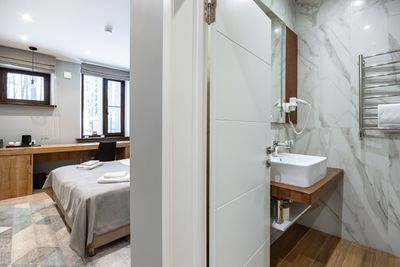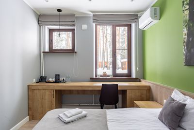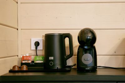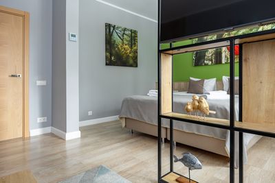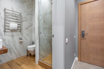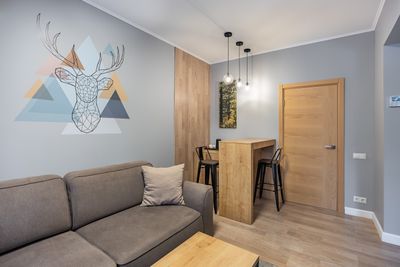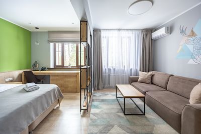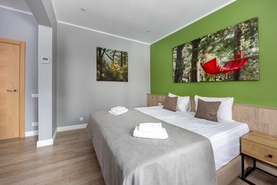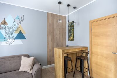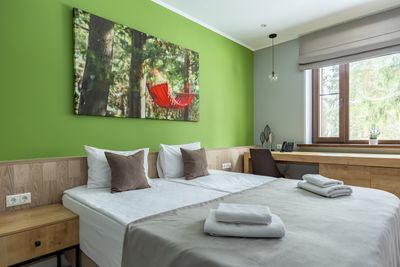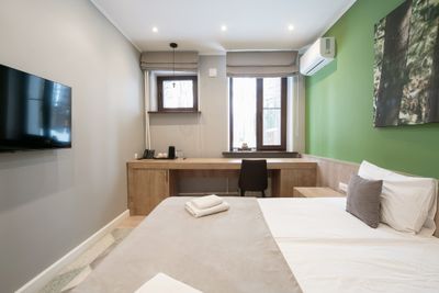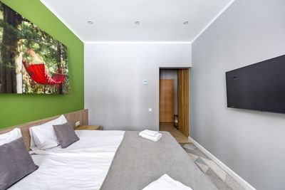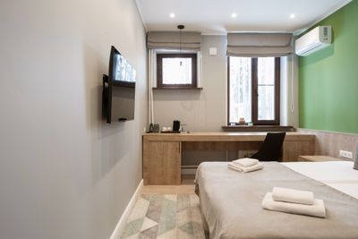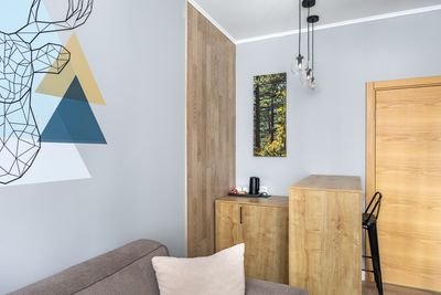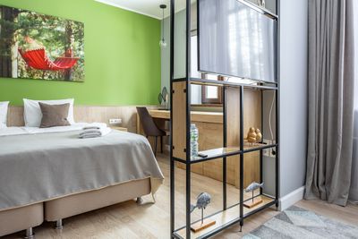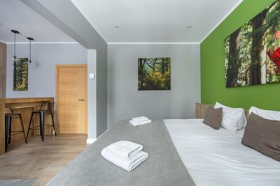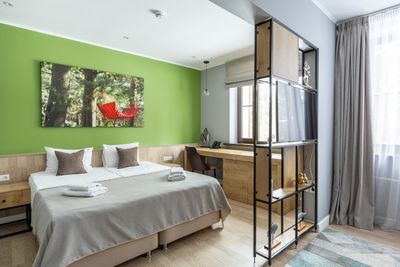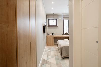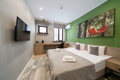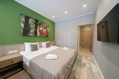 В апартаментах приятные оттенки интерьера помогают настроиться на отдых. В санузле порадовали теплые полы. В мелочах заметна забота о гостях: начиная от сложенного треугольником конца туалетной бумаги, заканчивая тем, что гостям кроме стандартных наборов для гигиены, предлагаются одноразовые бритвенные наборы, расчёска и наборы для шитья. В холодильнике есть мини-бар с хоть и завышенными, но доступными ценами